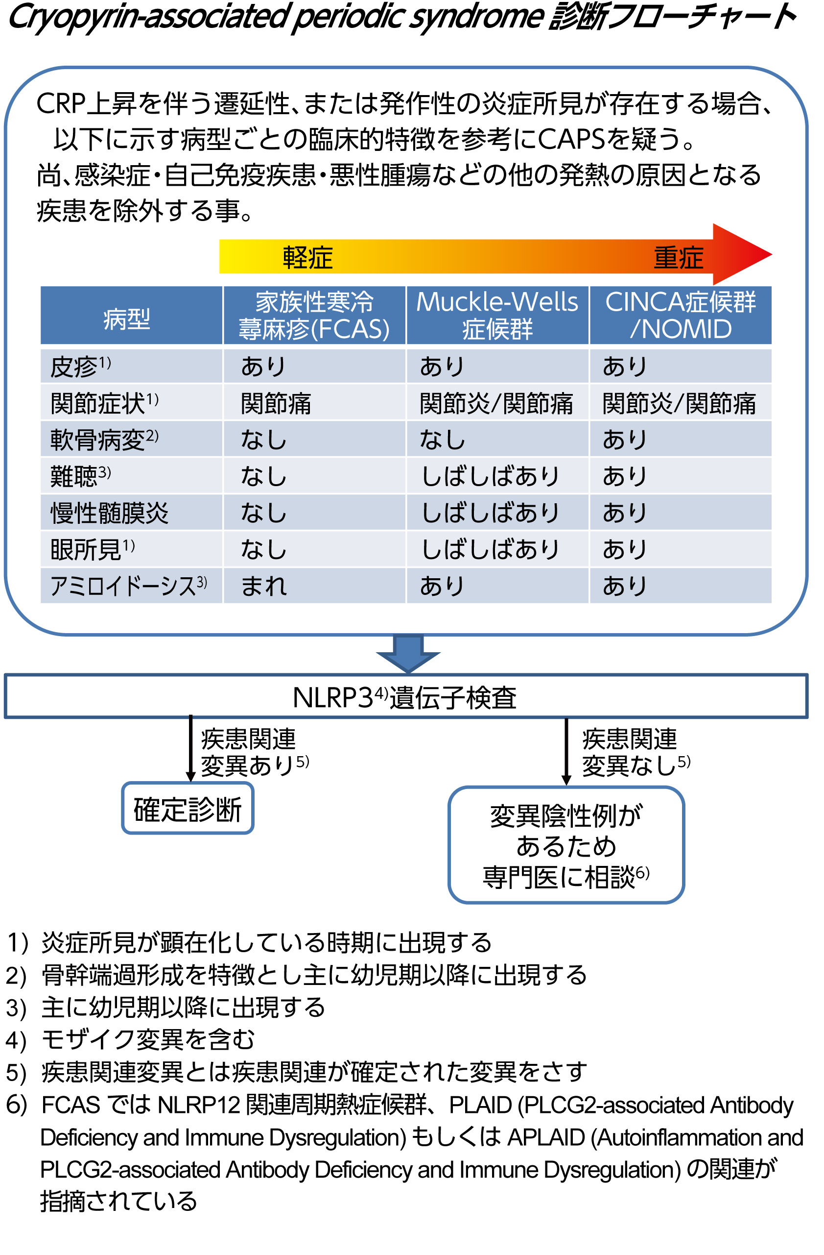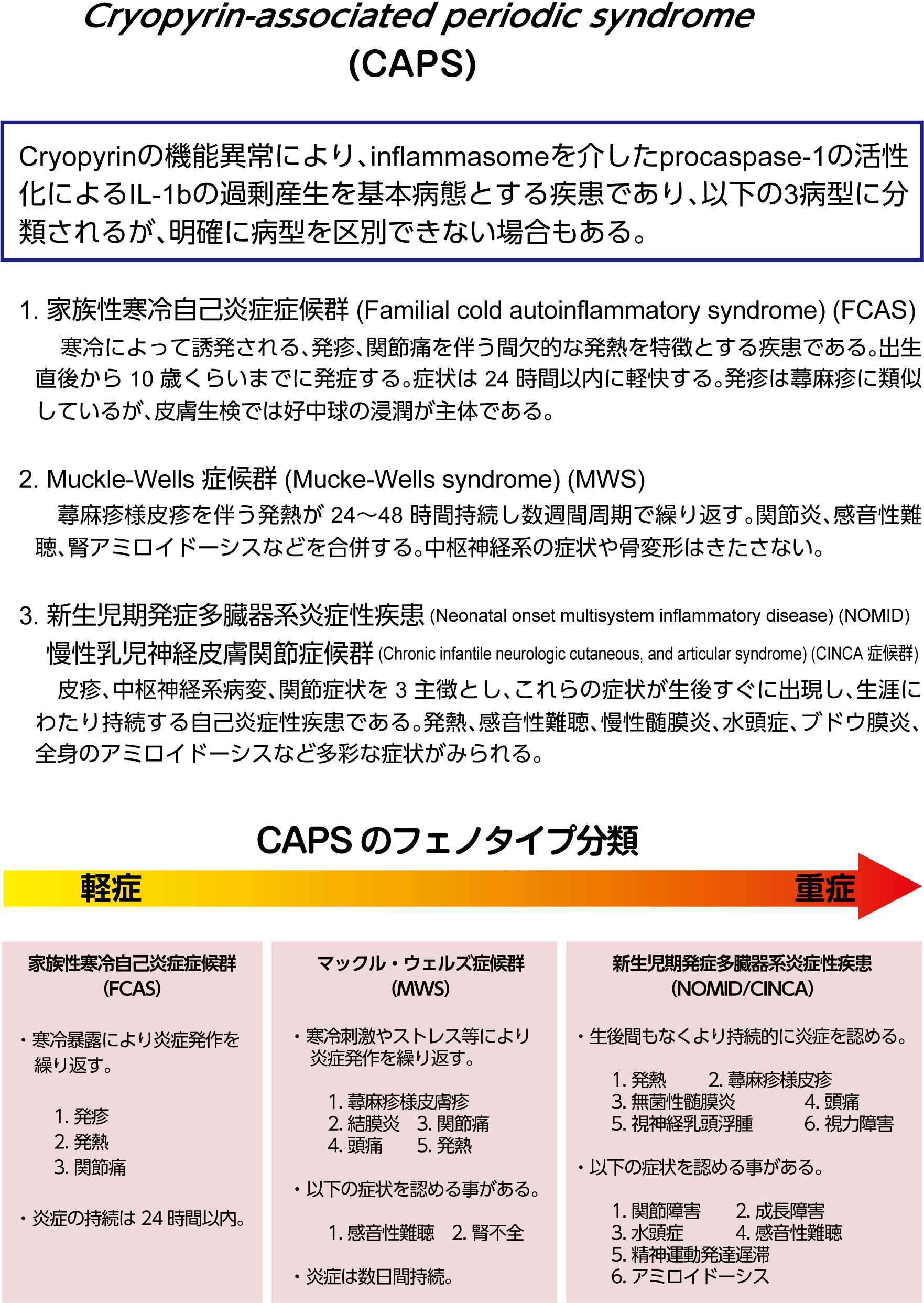 有効な治療で国内で使用可能なものはカナキヌマブ(イラリス®)である。基本的には、MWS、NOMID がカナキヌマブ(イラリス®)による治療の対象となる。FCASは軽症例では有症状時にNSAIDSとステロイド短期投与でも治療可能であるが、発作頻度や症状の強い例、アミロイドーシスのリスクのある症例ではカナキヌマブ(イラリス®)の導入を考慮する。