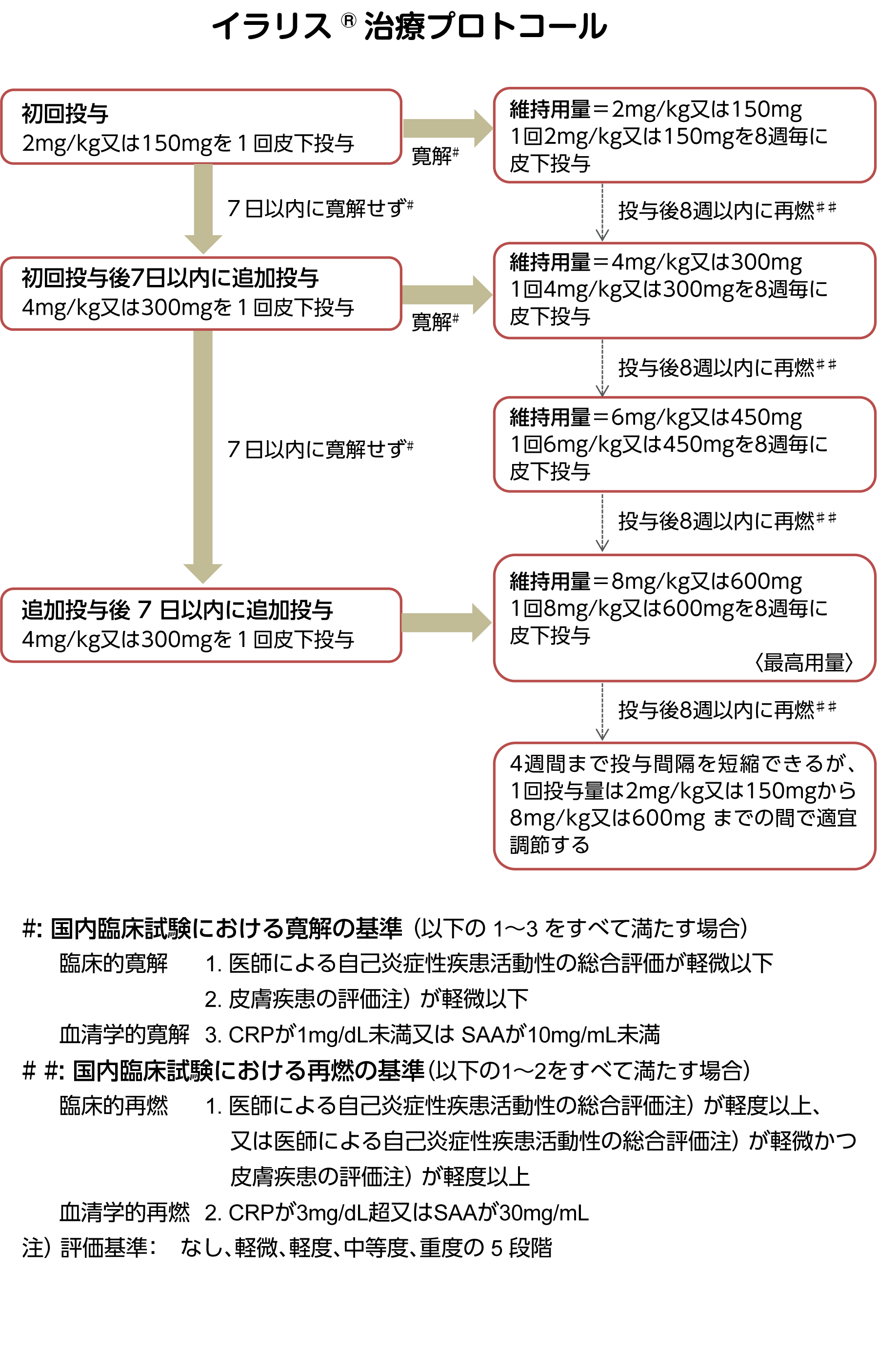 通常、体重 40 kg 以下の患者にはカナキヌマブ(イラリス®)として 1 回 2 mg/kg を、体重 40 kg を超える患者には 1 回 150 mg を 8 週毎に皮下投与する。 十分な臨床的効果(皮疹及び炎症症状の寛解)がみられない場合には適宜漸増するが、1 回最高用量は体重40 kg 以下の患者では 8 mg/kg、体重40 kg を超える患者では 600 mg とする。最高用量まで増量し、8 週以内に再燃がみられた場合には、投与間隔を 4 週間まで短縮できる。なお、症状に応じて 1 回投与量の増減を検討すること。